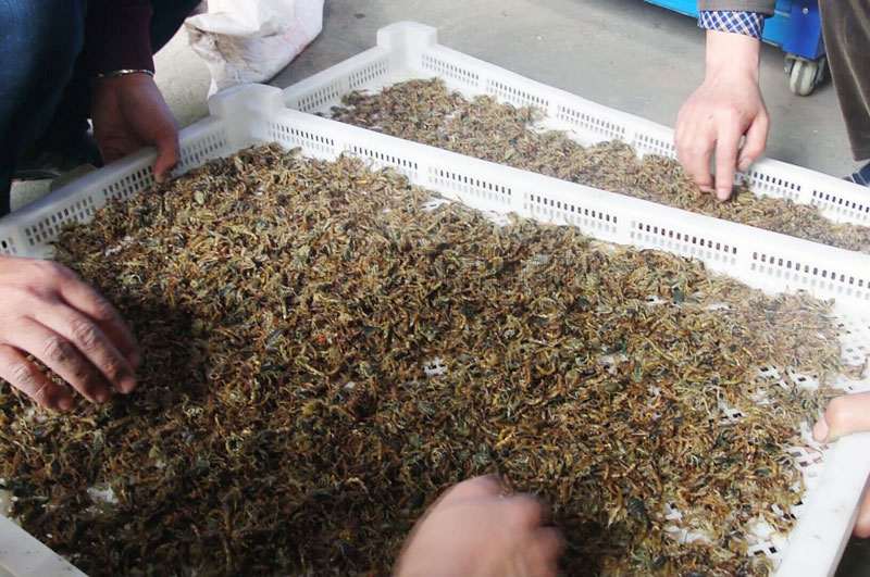 隨后,由我廠技術(shù)人員陪同客戶,為客戶演示整個(gè)加工過(guò)程,加工前先把蝎子用冷水浸泡,并反復(fù)沖洗幾次,以洗掉蝎子身體上的泥土和其他雜物,洗凈后撈出,放到事先準(zhǔn)備好的盆內(nèi)。