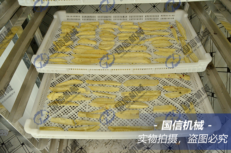 6.烘干:將切好塊或條狀的地瓜(紅薯)均勻擺放于托盤,后放置在推車推入烘干房,通過空氣能熱泵烘干房的觸摸屏進(jìn)行烘干設(shè)置,初始溫度設(shè)置65℃,時長設(shè)置四小時,第二段溫度60℃,時 間長度也是四小時,第三階段將溫度設(shè)置到55℃,烘干到預(yù)期的水分含量后,空氣能地瓜烘干房會自動完成整個烘干過程,結(jié)束后自動停止。