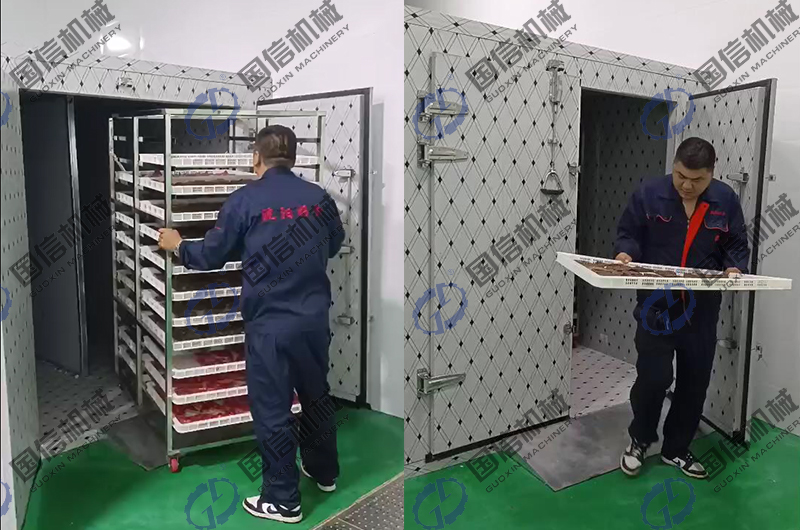 4. 烘干:將腌制好的牛肉條,均勻一致的懸掛在烘干房內(nèi)進行烘干,烘干房的熱風(fēng)循環(huán)系統(tǒng)和排濕系統(tǒng),可以提高烘干效率,精準(zhǔn)控溫控濕的智能化操控模式可以使牛肉烘干房的烘干模式接近自然風(fēng)干,保證牛肉干肉質(zhì)鮮美。
