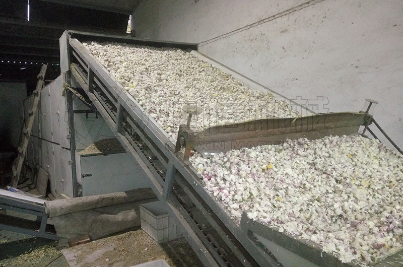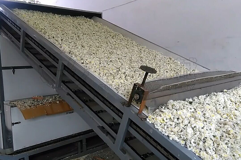 新鮮菊花的烘干我們用無硫烘干法,設備采用網帶式菊花烘干機進行烘干,通過自下而上穿過網帶及物料層的熱氣流使菊花花朵溫度升高,均勻干燥。無硫烘干法有效避免硫磺污染,是國家大力提倡產業(yè),市場前景廣闊。