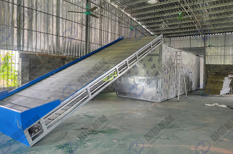 網(wǎng)帶式木瓜絲烘干機主要由烘干箱體、熱交換爐、輸送裝置、均料裝置、保溫裝置、熱風輸入裝置、電控溫控裝置等構成。與物料的接觸件為純不銹鋼材質,全套設備運行可靠,沒有易損件。經(jīng)過處理后的木瓜絲由輸送帶送到頂部上層網(wǎng)帶上,木瓜絲隨網(wǎng)帶呈“S”形從上層往下層移動,熱氣流自下而上穿過網(wǎng)帶及其上的物料層,多層循環(huán)翻轉,逐層烘干,直至烘干完成,烘干后的木瓜絲從底層的出料口排出。在落料過程中,物料受熱面改變,保證干燥的均勻性。